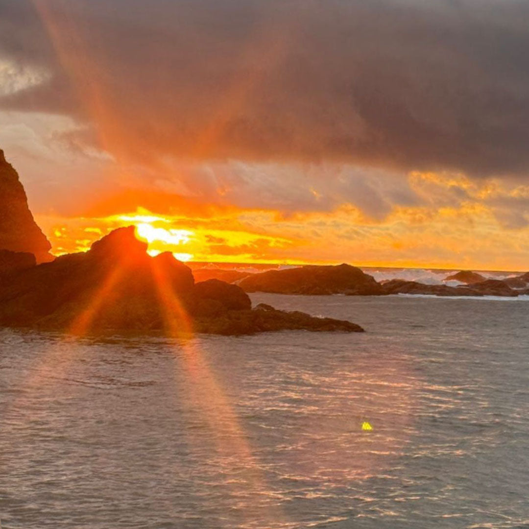Contempla el cielo encendiéndose en tonos dorados y violetas.